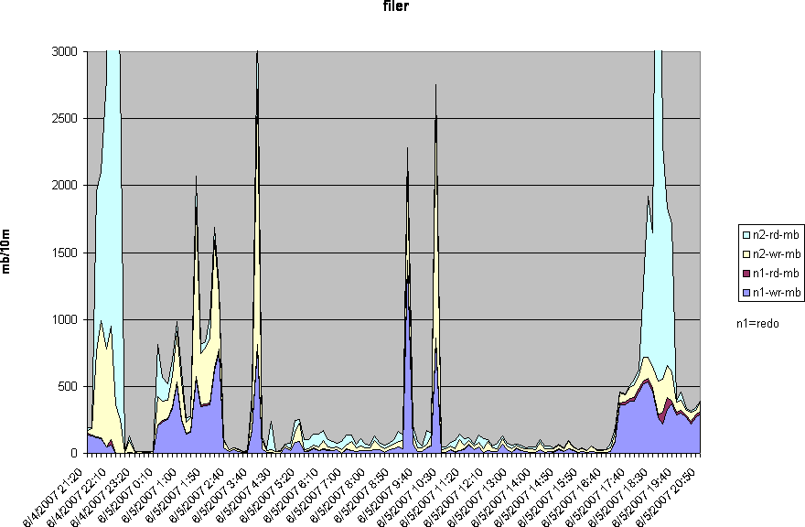 Well I did end up figuring something out – and with a few clicks in excel got some decent graphs too. There are actually two NetApp Filers being used (the redo logs were split onto a different head) and I was able to separate out read and write traffic to each head. Here’s what I was able to get for Tue, Wed, and Thu of last week: