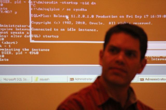 - Jeremiah Wilton had a session about Oracle vs SQL Server Deathmatch. He did several awesome things, like running both databases on a single server with the same load generator on both to make them compete for resources. The goal was to determine who was stronger. He also ripped out a data block from each and stuffed it into the other’s datafile. :)