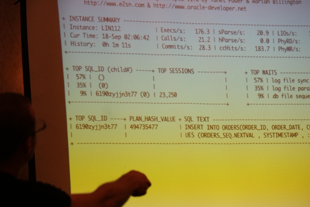 - Tanel Poder continues to think of incredibly clever tricks. Before starting his in-depth session about logging, he opened SQLPlus and typed “select * from top”. What happened next was an Oracle database version of unix “top” – inside sqlplus, complete with screen refreshes!! Very cool.