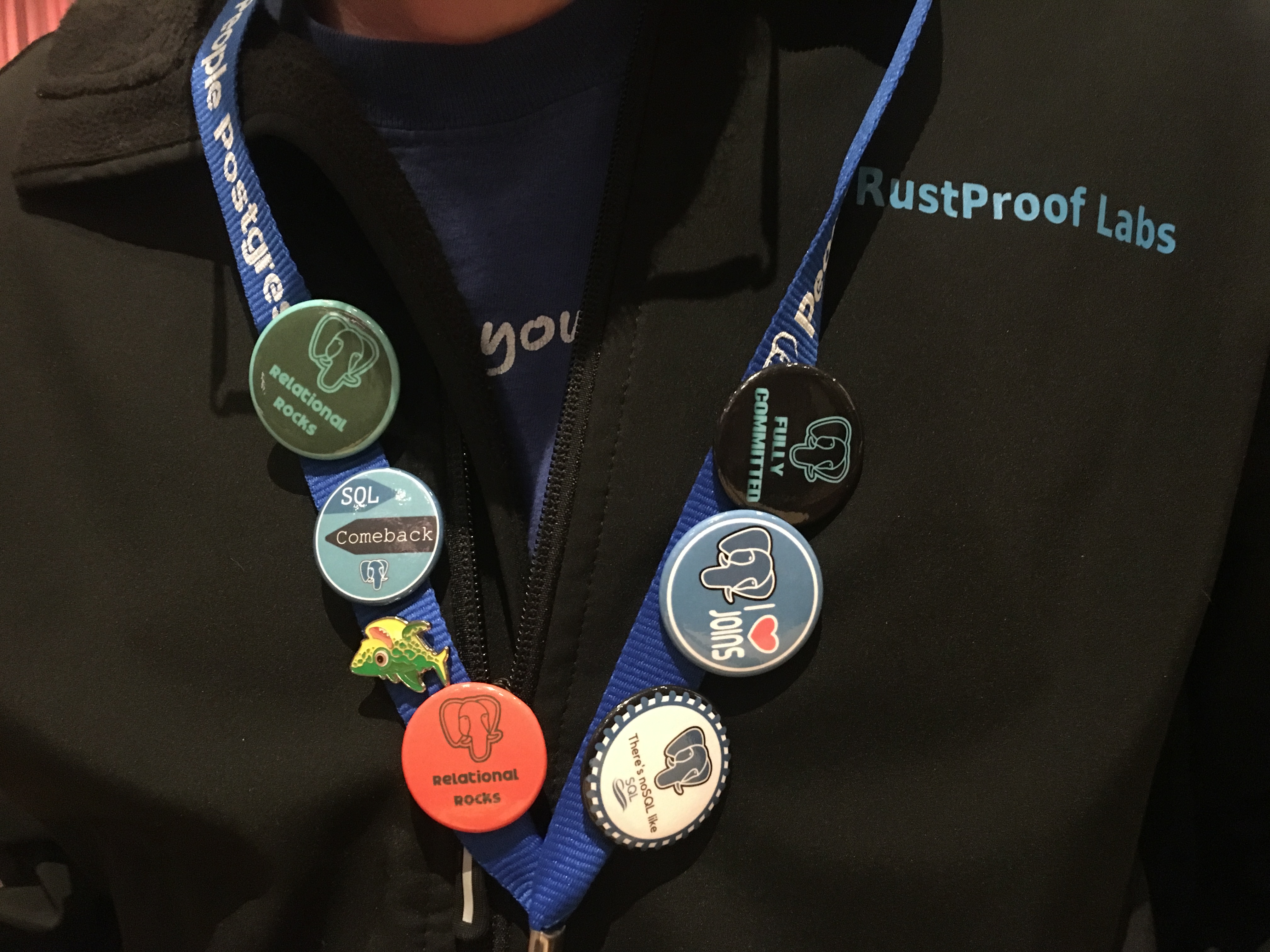 PostgresConf sponsored ordering a bunch of real stickers and pins with the designs created by these high school students. And we had some fun with this on the exhibition floor: each booth got one or two designs, and attendees who wanted to get all the sticker/pin designs would have to hunt around. In case you’re wondering whether anyone got them all… on Friday, I discovered at least one person who did: Ryan Lambert of RustProof Labs!