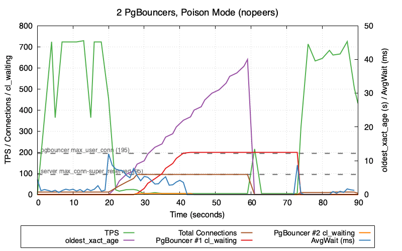 This graph shows 2 PgBouncers in poison mode (nopeers)—the worst-case scenario: