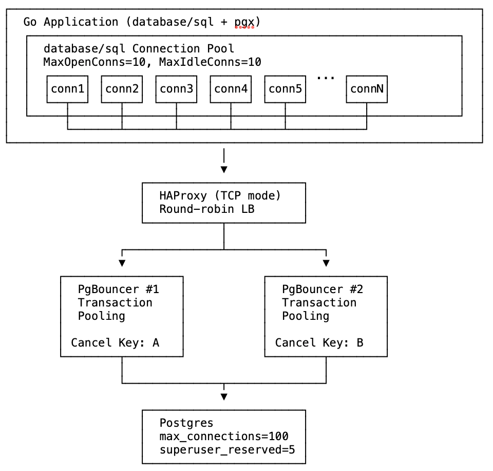 | 2 PgBouncers | ~50% cancels route to wrong instance | Cancels fail, connection exhaustion |