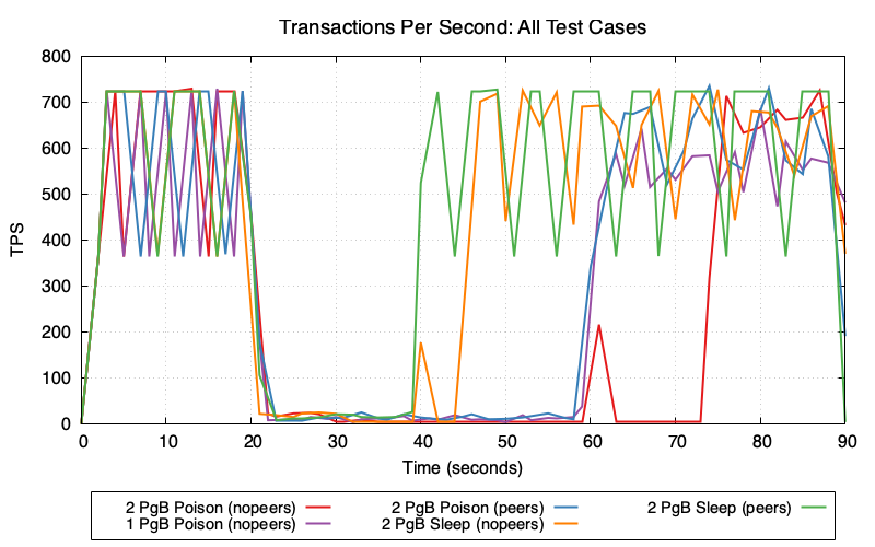 TPS is the best indicator of actual application impact. It’s important to notice that PgBouncer peering does not prevent application impact from either poisoned connection pools or sleeping sessions. The section below titled “Detection and Prevention” has ideas which address the actual root cause and truly prevent application impact.