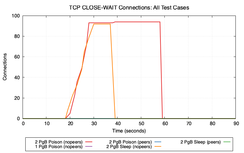 - Total Connections (brown) climb rapidly after poison injection at t=20 as failed cancels leave backends in CLOSE_WAIT