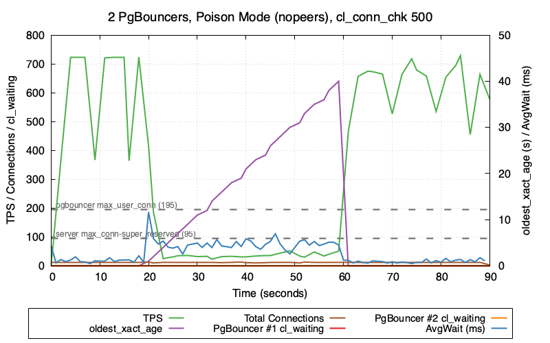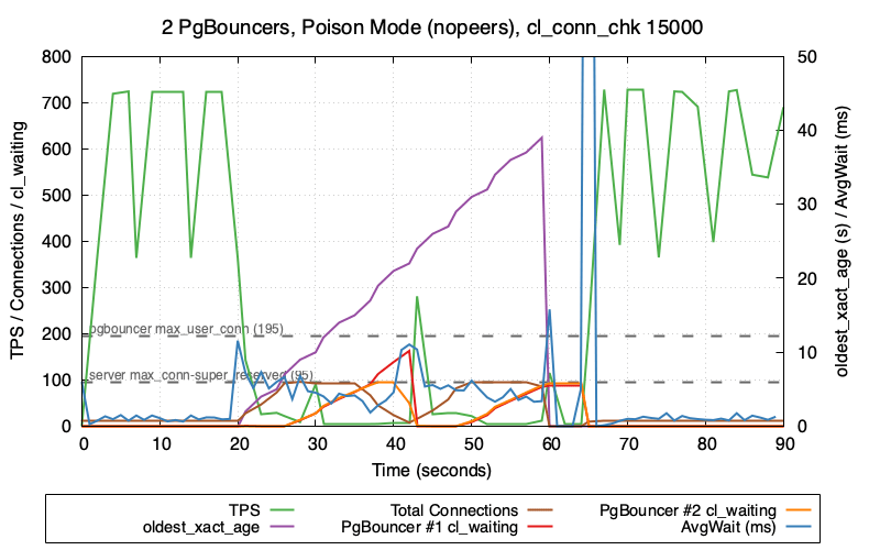 Fascinating! The brown line and the red line are the important ones. As before, the TPS drops at T=20sec and zeros out after we hit max_connections. But at T=35sec we start to see the total connection count slowly decrease! This continues until T=42sec when the PgBouncer connections are finally released – and at this point we repeat the whole cycle a second time, as the number of total connections climbs back up to the max.