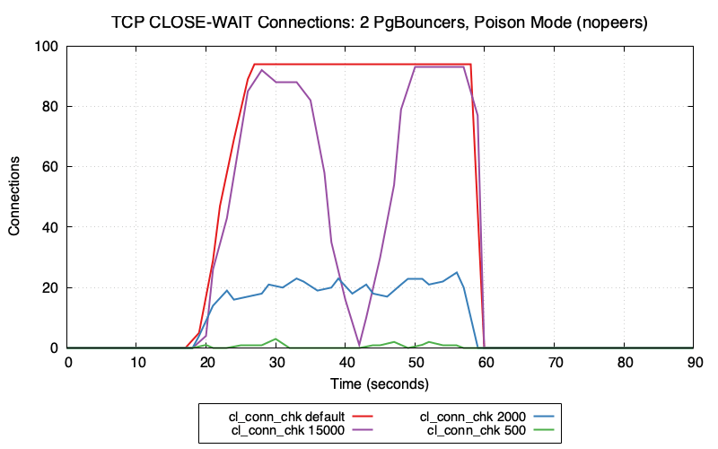 So we can see that the 15 second client_connection_check_interval setting is working exactly as expected (if a little slowly) – at the 15 second mark Postgres begins to clean up the dead connections.