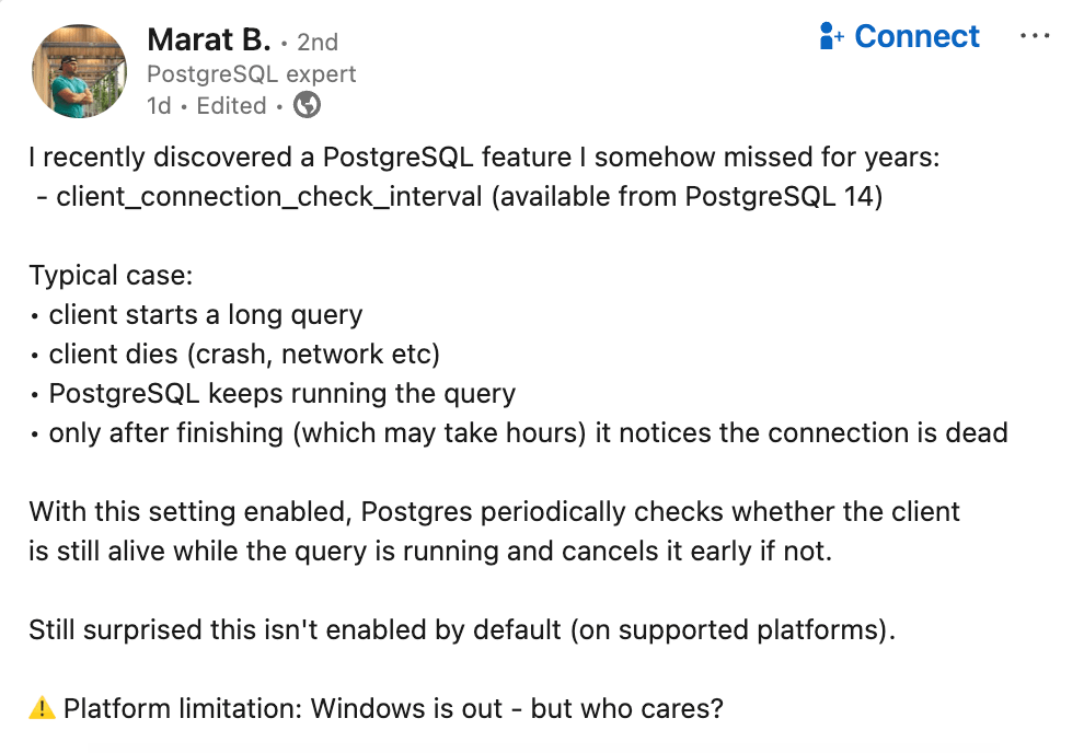 I also somehow missed this setting for years. And it’s crazy timing, because it’s right after I published a blog about seeing the exact problem this solves. In my blog post I mentioned “unexpected behaviors (bugs?) in… Postgres itself.” Turns out Postgres already has the fix; it’s just disabled by default.