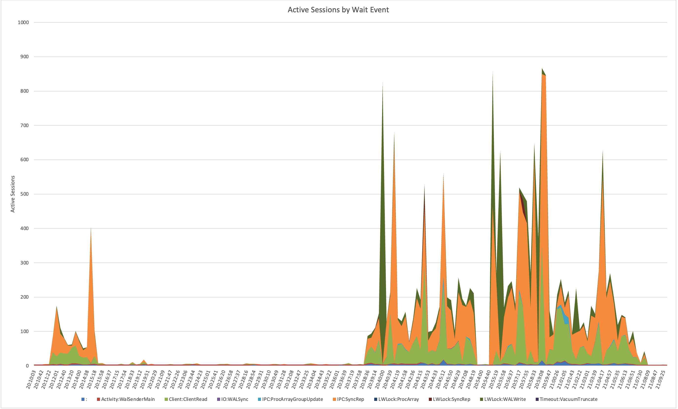 Notice how there are periodic spikes of hundreds of connections waiting on IPC:SyncRep for this system during the test runs: (nb. the plain colon represents CPU time)